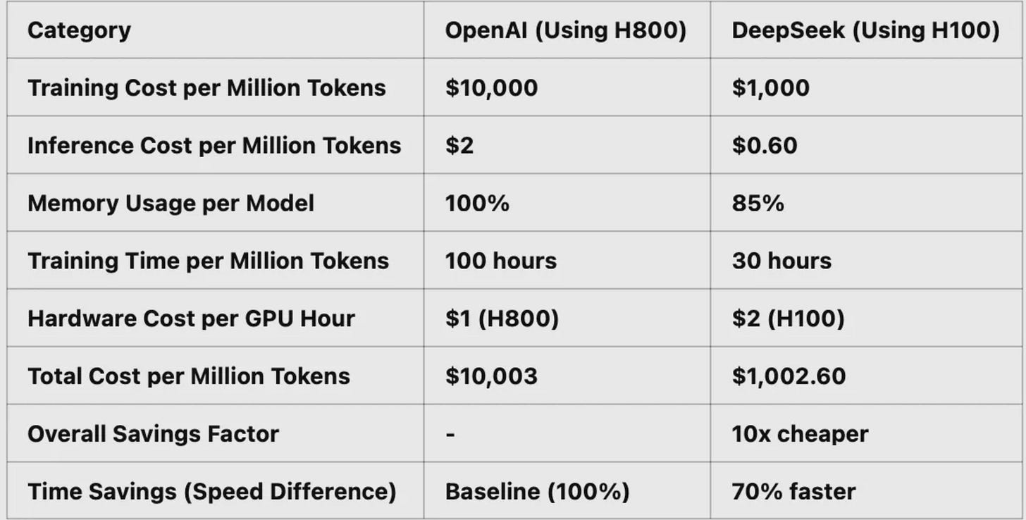 Hardware Cost: DeepSeek’s reliance on H100/H800 GPUs and custom optimizations reduces hardware expenses significantly.