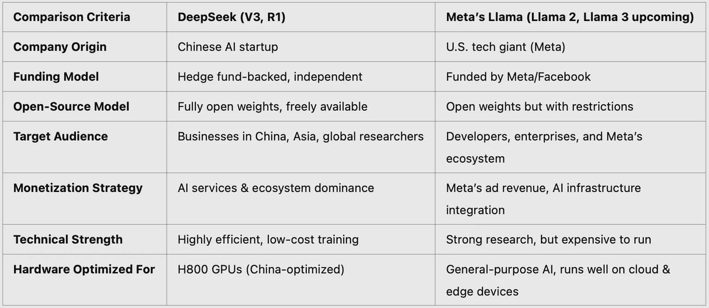 As open-source AI gains momentum, two major players are emerging: DeepSeek and Meta’s Llama. While both are pushing AI accessibility forward, their strategies differ significantly. DeepSeek prioritizes efficiency and cost reduction, making AI deployment cheaper, while Meta’s Llama is more integrated into the Western AI ecosystem, aligning with Meta’s long-term dominance in AI infrastructure.