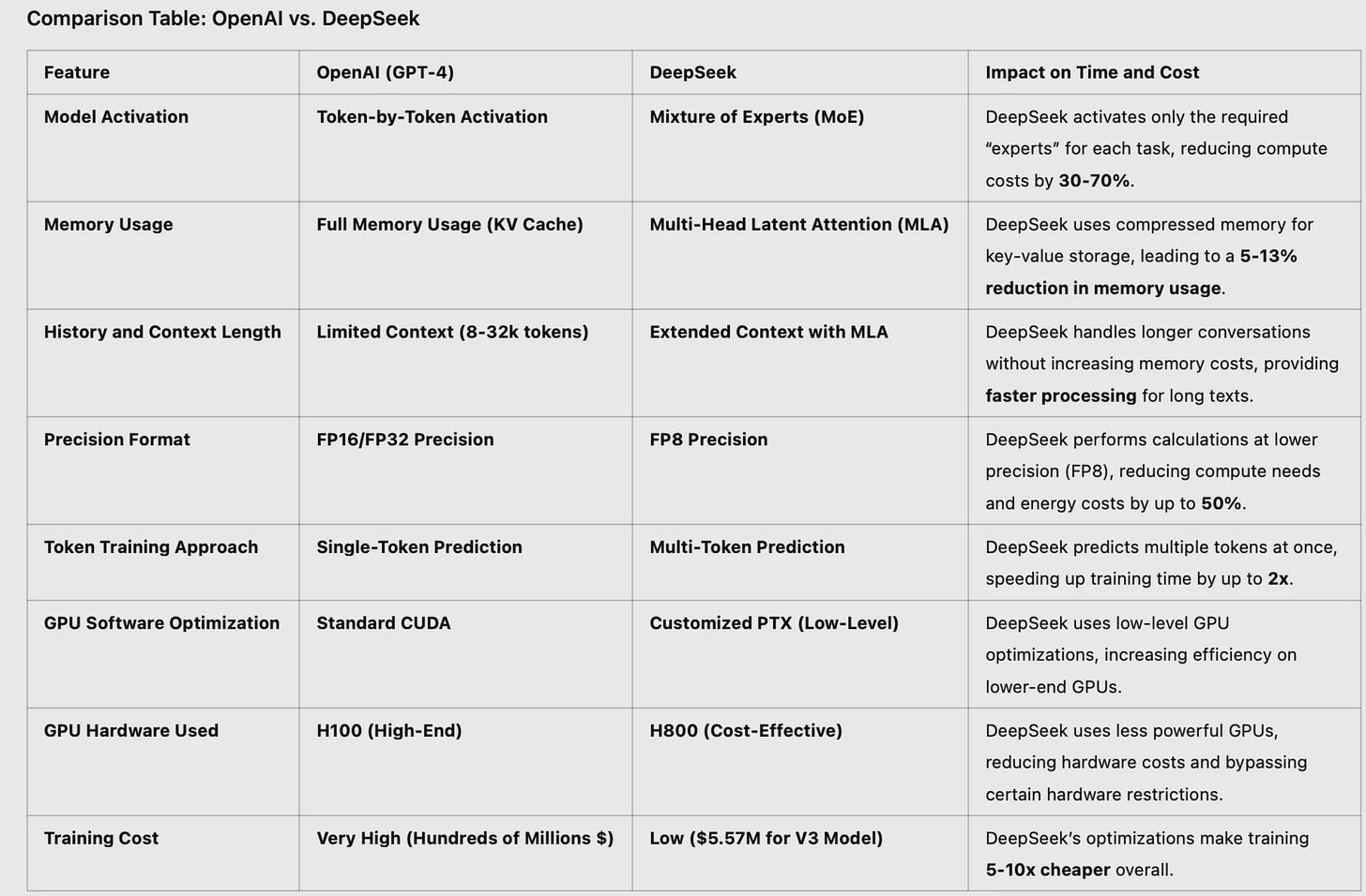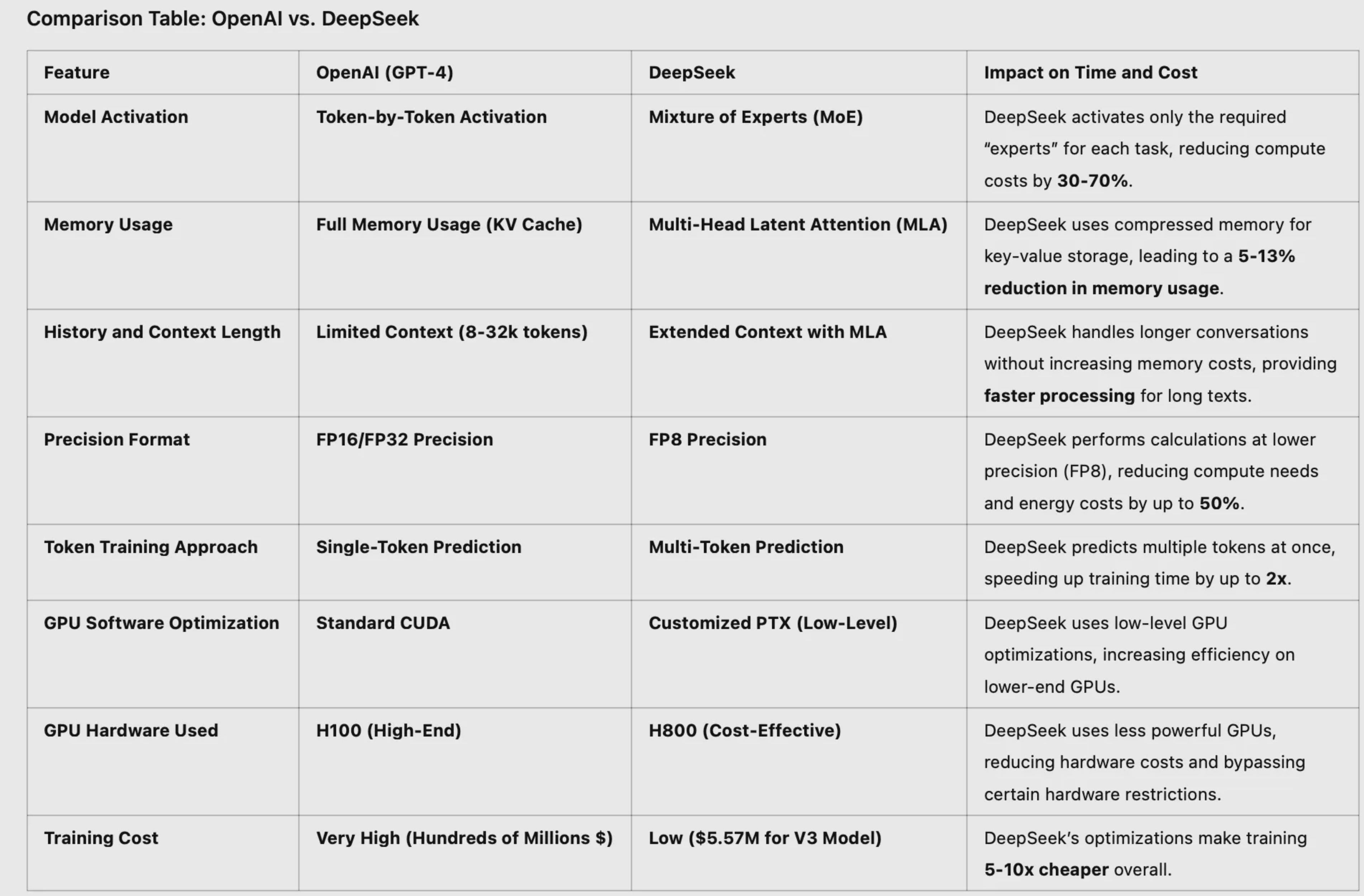 Training Cost Reduction: DeepSeek achieves up to 5-10x lower training costs compared to OpenAI.